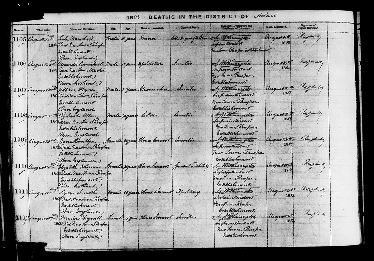 d. 24th August 1883 in the New Town Pauper Establishment, Tasmania, Western Australia. His profession at the time was Miner.